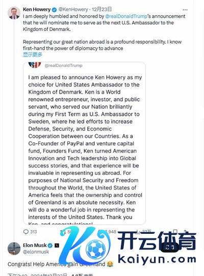 马斯克也火速在豪厄里的X平台账号留言,庆祝豪厄里被提名之时不忘敦促豪厄里帮好意思国拿下格陵兰岛。