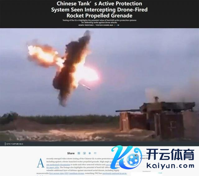 最近曝光的一段视频开云官网切尔西赞助商,展示了中国 GL-6 主动防患系统(APS)测试情况,包括阻拦无东说念主机辐射的火箭弹镜头。