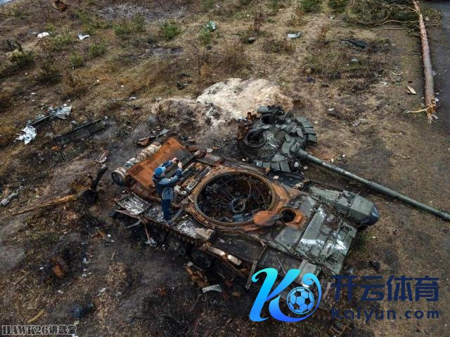 被乌克兰无东说念主机炸毁的俄罗斯 T-72B3 主战坦克。